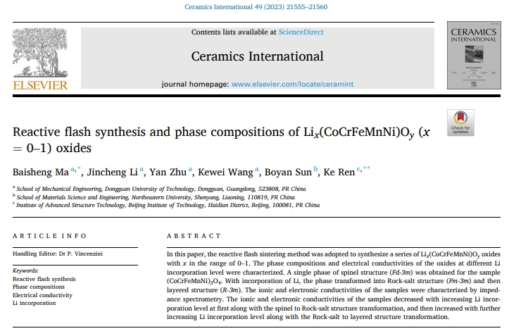 文章以“Reactive flash synthesis and phase compositions of Lix(CoCrFeMnNi)Oy (x = 0-1) oxides”为题发表于专业陶瓷期刊《Ceramics International》。