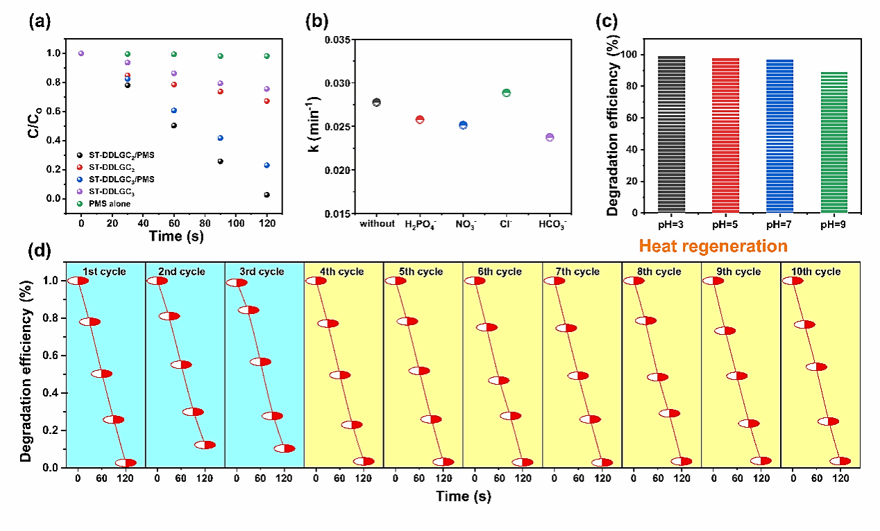 该研究通过低温炭化固定废弃生物质(灵芝药渣)自身的中空显微结构,通过高温活化炭化在管壁上造孔,成功制备了多孔碳纳米管(ST-DDLGCx),并用于卡被他滨的催化降解和超级电容器的电极材料。ST-DDLGC2对无机阴离子具有良好的抗干扰能力,并且在较宽的pH范围内具有优异的性能性能,120 min后对CAP的降解率为97.3%。作为超级电容器电极,当电流密度为0.5A g-1时,ST-DDLGC3基超级电容器装置的比电容高达328.1 F g-1。当循环10,000次后,电容的保持率为98.6%。结果表明,自模板生物质基多孔碳管具有优异的PMS活化能力和超级电容器电极性能。本研究提供了一种环境可持续和低成本的碳材料制备方法,可用于解决实际应用中的环境和能源问题。