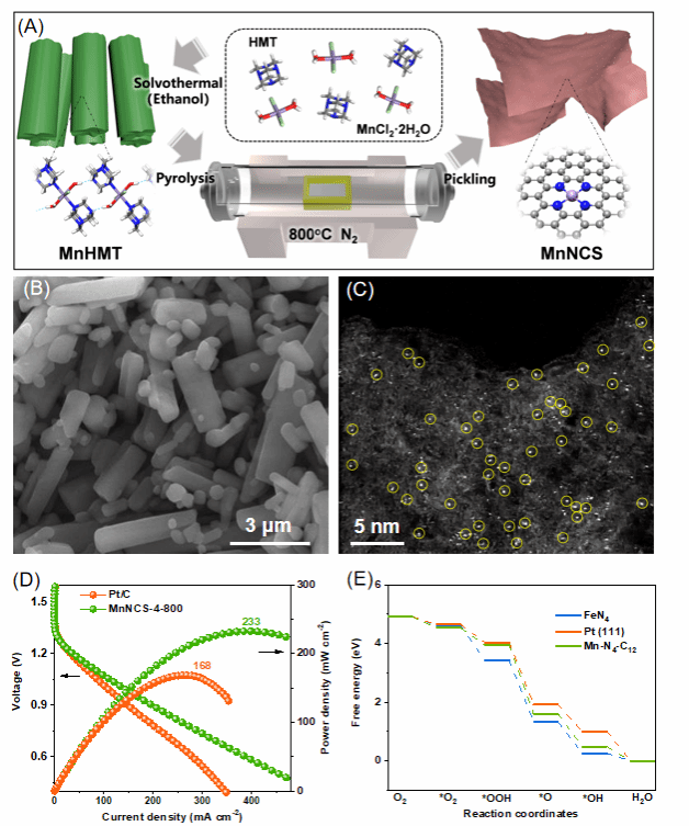 基于此,本文报道了一种结构可控的锰-六亚甲基四胺配位框架材料 (MnHMT),作为前驱体高温热解制备了一系列锚定了氮配位单原子锰的碳纳米片 (MnNCS)。Mn与HMT的配比是决定MnHMT结构与形貌的关键因素,Mn与HMT的摩尔比小于2时,MnHMT为块体状;Mn与HMT的摩尔比大于2时,MnHMT为棒状。棒状MnHMT中弱的氢键有利于其热解过程中形成多孔的超薄碳纳米片和原子分散的Mn-Nx位点。其中,最优的MnNCS在半电池 (酸性和碱性介质下的半波电位分别为0.89和0.76 V vs. RHE) 和锌-空气电池 (峰值功率密度为233 mW cm-2) 中显示出了优异的氧还原性能。值得注意的是,MnNCS对Fenton反应的弱的催化活性使得其具有明显高于铁-氮-碳催化剂的稳定性。实验和DFT理论计算表明,MnNCS优异的氧还原性能源于其多孔超薄碳结构和原子分散的MnN4位点。DFT计算进一步证实,Mn-N4-C12位点对氧还原反应中间体具有良好的吸附作用,特别是对速率控制步骤 (*OH的吸附) 具有合适的吸附。综上,本工作为开发新型金属配位聚合物及其衍生的单原子催化剂提供了新的路径。