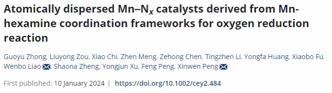 近日,我校广东省分布式能源系统重点实验室、广东高校非粮生物质高效热解利用工程技术研究中心纳米材料与催化团队在新能源单原子催化剂研究中取得重要进展,相关研究成果以“Atomically dispersed Mn–Nx catalysts derived from Mn-hexamine coordination frameworks for oxygen reduction reaction”(论文链接:https://doi.org/10.1002/cey2.484) 为题发表在化学、能源、材料领域国际权威期刊《Carbon Energy》(中国科技期刊卓越行动计划“高起点新刊”)。化学工程与能源技术学院钟国玉副教授为第一作者,廖文波特聘教授和华南理工大学彭新文教授为主要通讯作者,傅小波教授参与了论文的指导和研究工作。