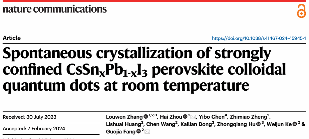 2024年2月21日,yl6809永利检测中心周海特聘教授课题组联合武汉大学方国家教授课题组在Nature Communications(《自然•通讯》)上在线发表了关于纯碘全无机锡铅钙钛矿量子点的最新研究成果。