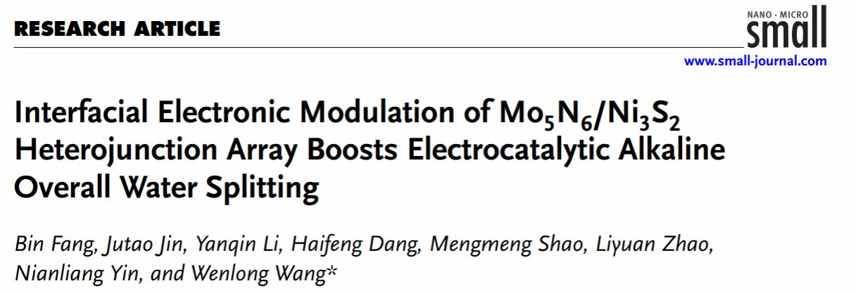 近期,我校汪文龙研究员团队在电解水制氢催化剂领域取得研究进展,相关成果以“Interfacial Electronic Modulation of Mo5N6/Ni3S2 Heterojunction Array Boosts Electrocatalytic Alkaline Overall Water Splitting”为题发表在材料学领域TOP期刊《Small》。该论文以yl6809永利检测中心为第一单位,博士后方彬是该论文的第一作者,汪文龙研究员为通讯作者。