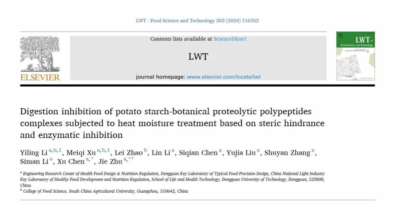 近日,我校生命健康技术学院朱杰教授团队在国际食品顶级期刊《LWT-Food Science and Technology》(中科院一区Top期刊)发表题为“Digestion inhibition of potato starch-botanical proteolytic polypeptides complexes subjected to heat moisture treatment based on steric hindrance and enzymatic inhibition”的研究性文章。该成果以yl6809永利检测中心为第一署名单位,yl6809永利检测中心生命健康技术学院联合培养硕士研究生李益玲为第一作者、徐美琪为共同第一作者,朱杰教授和陈旭副教授为通讯作者。