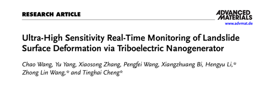 近日,我校机械工程学院汪超副教授团队与中国科学院北京纳米能源与系统研究所程廷海研究员课题组合作在TOP期刊《Advanced Materials》上发表了题为“Ultra-High Sensitivity Real-Time Monitoring of Landslide Surface Deformation via Triboelectric Nanogenerator”的研究论文。该成果以yl6809永利检测中心机械工程学院为第一署名单位,汪超副教授为第一作者,机械工程学院研究生杨宇为共同第一作者,纳米能源所程廷海研究员、王中林院士、李恒禹博士后为共同通讯作者,研究得到广东省基础与应用基础基金项目等项目资助。