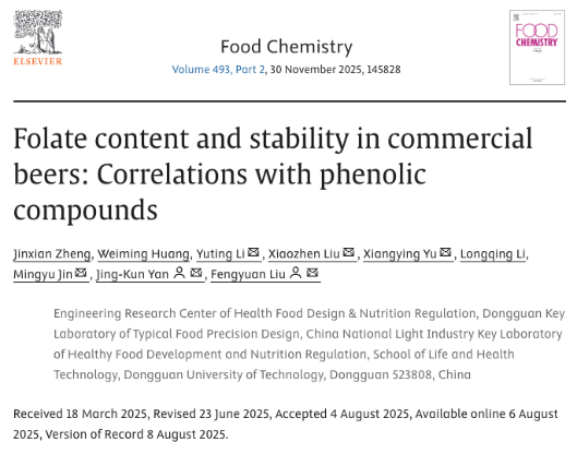 2025年8月,生命健康技术学院硕士研究生郑锦贤以第一作者身份于国际食品顶级期刊《Food Chemistry》在线发表题为“Folate content and stability in commercial beers: Correlations with phenolic compounds”的研究性文章。生命健康技术学院刘丰源助理研究员和闫景坤教授为该论文共同通讯作者。