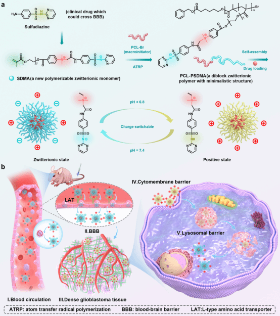 体内的多重生物屏障严重限制了纳米药物向肿瘤组织的递送效率。为克服上述屏障,传统的纳米药物通常依赖复杂的分子结构设计,显著增加了临床转化的难度。本研究独辟蹊径,从已上市临床药物中汲取灵感,基于治疗流行性脑膜炎的抗菌药物磺胺嘧啶具有高效穿越血脑屏障的能力及其酸碱电离常数(pKa)约为6.5的理化特性,设计并合成了一种新型两性离子单体SDMA,并以聚己内酯(PCL)作为疏水链段,通过原子转移自由基聚合(ATRP)制备了PCL-PSDMA双嵌段共聚物。该共聚物自组装形成的载药纳米粒结构简单,无需引入任何外源性靶向配体或复杂的刺激响应功能基团。PCL-PSDMA纳米粒在生理环境中呈两性离子状态,可有效规避免疫识别,延长血液循环时间,并通过脑血管内皮细胞上L型氨基酸转运蛋白(LAT1)介导的转运机制高效穿越血脑屏障。到达肿瘤微酸环境后,纳米粒由两性离子状态转变为带正电荷状态,促进深层肿瘤组织渗透并显著增强肿瘤细胞的摄取效率。进入溶酶体酸性环境后,其正电性进一步增强,可破坏溶酶体膜,实现高效的内体逃逸。得益于在克服五重连续生物屏障方面的优异性能,PCL-PSDMA纳米粒能够将抗癌药物有效递送至脑胶质瘤细胞内部,显著提升脑胶质瘤的治疗效果。