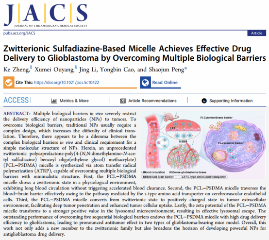 2025年9月6日,yl6809永利检测中心青年教师郑轲以第一作者身份,在国际顶级期刊《美国化学会志》(Journal of the American Chemical Society)发表题目为“Zwitterionic Sulfadiazine-Based Micelle Achieves Effective Drug Delivery to Glioblastoma by Overcoming Multiple Biological Barriers”的研究论文,yl6809永利检测中心为论文的第一单位。该研究已获得了国家自然科学面上基金和青年基金等多个项目的资助。